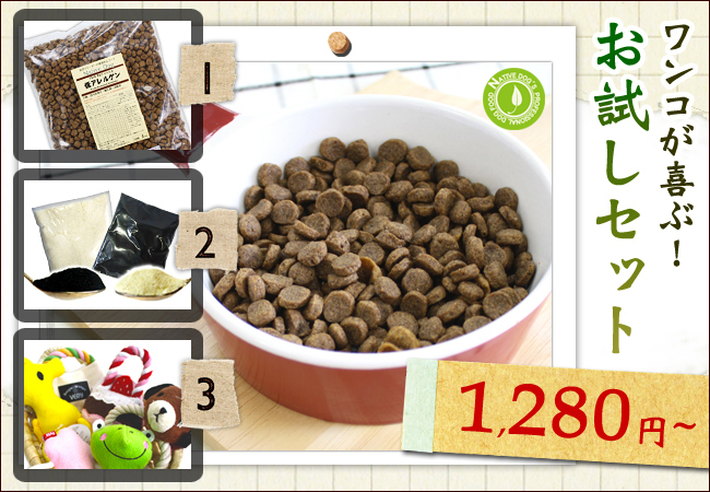 お試しセットはネイティブドッグを初めて試す方にはとてもお奨めです。選べるフード1kg+サプリメント+豪華特典までついて1280円〜【送料無料】です。