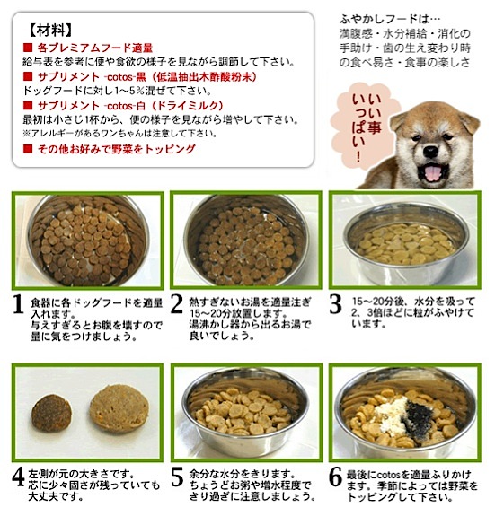 ふやかしフードのメリットは食欲旺盛なワンコ達の満腹感を与えられる事や幼犬期の消化の手助け、水分補給、食事の楽しさ、歯の生えかわり時の食べやすさの為です。